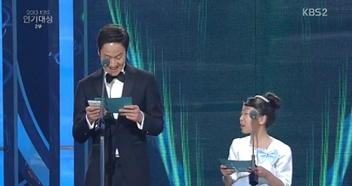 배우 정우는 지난 12월31일 서울 여의도 KBS홀에서 진행된 ‘2013 KBS 연기대상’에서 아역 김환희와 함께 네티즌상 시상자로 나섰다.