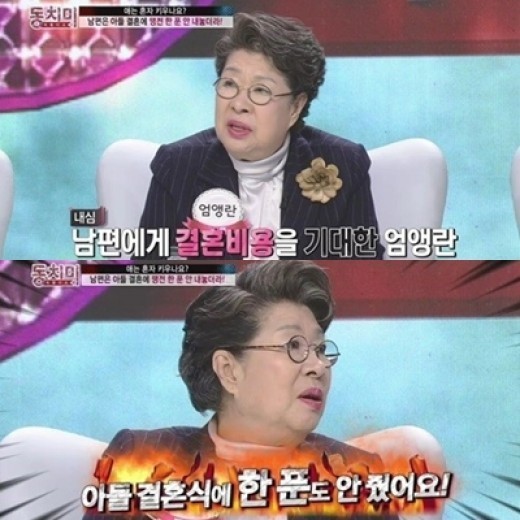 이날 엄앵란은 아들 결혼식에 대해 “아들이 꽤 나이들어 장가를 가게 됐다. 아버지로서 남편에게 결혼비용을 기대했다. 하다못해 10분의 1 이상은 보태줄 줄 알았다”며 “집을 따로 살아서 그런지, 아들 결혼식에 한 푼도 안준 것 같다. 그렇다고 무조건 돈을 내라고 할 수도 없는 노릇이어서 그냥 넘어갔다”고 털어놨다.