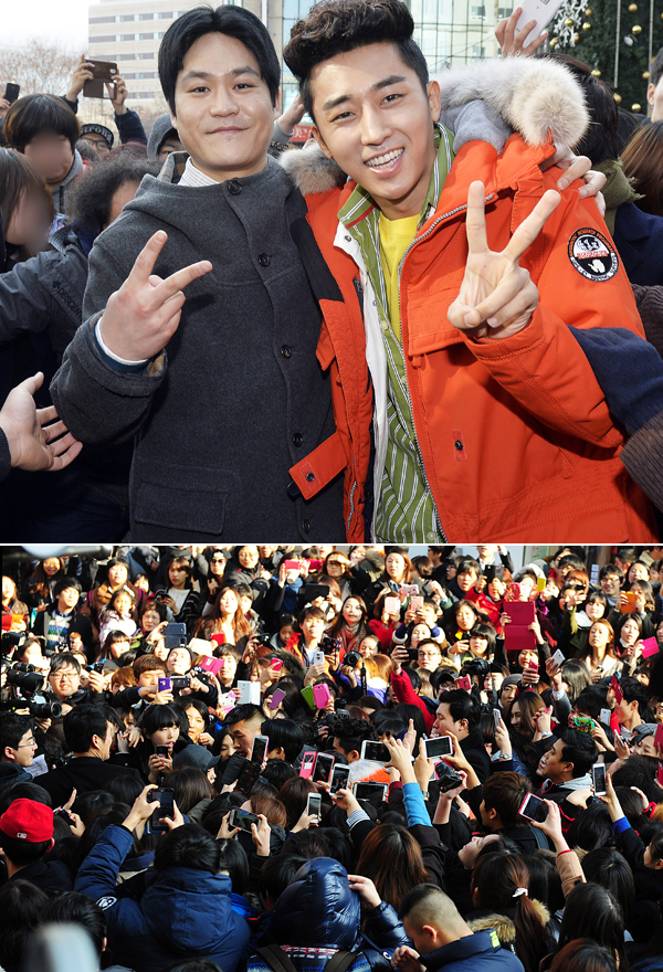 이날 명동에 모습을 드러낸 손호준은 극중 해태와 똑 같은 헤어스타일에 패션을 선보였으며 김성균 역시 삼천포 캐릭터 가발과 추억에 이른바 ‘떡볶이’ 코트까지 입어 좌중의 시선을 사로잡았다.