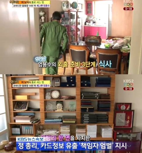 제작진은 서울 동작구에 위치한 엄용수의 집을 방문했다. 엄용수의 집은 남자 혼자 사는 집임에도 깔끔하게 정리·정돈이 돼 있었다. 특히 거실 한 쪽을 가득 메운 책 더미가 눈길을 끌었다.