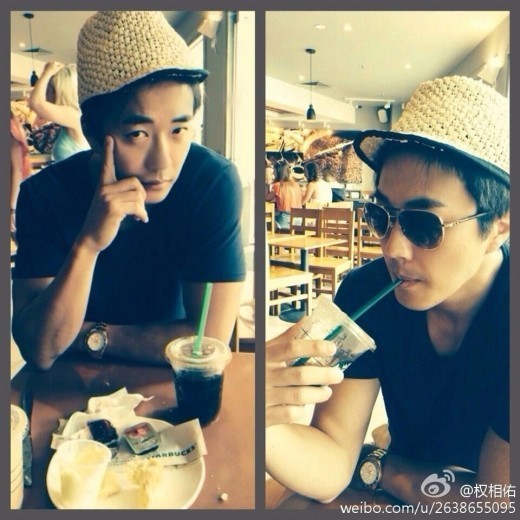 사진에서 권상우는 반팔 디셔츠와 보잉 선글라스, 시원한 디자인의 모자를 쓰고 아이스커피를 마시고 있다. 특히 남의 시선을 의식하지 않고 카페에 앉아 커피를 즐기는 모습이 한가롭고 편안해 보인다.