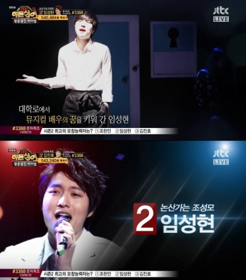 이날 두번째로 무대를 펼치게 된 임성현은 사전 인터뷰에서 “초등학교 3학년 때 가장 좋아하는 것을 쓰는 숙제가 있었는데 거기에 제가 조성모 노래라고 썼더라”고 밝혀 어린 시절부터 조성모 노래를 무척 좋아했다는 것을 인증해 보는 이들을 깜짝 놀라게 했다. 또한 뮤지컬 배우로서 활동하던 영상도 잠시 공개돼 시청자들의 눈길을 끌었다.