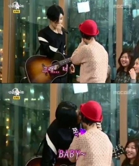 감미로운 목소리로 노래를 부르던 노민우는 갑자기 한 여성 방청객에게 다가가 볼에 기습적으로 ‘뽀뽀’를 하는 돌발행동을 벌여 스튜디오가 초토화됐다.