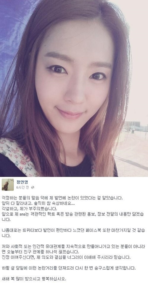 정인영은 “각설하고 제가 부주의했습니다. 앞으로 제 SNS는 객관적인 팩트 혹은 방송 관련된 홍보, 정보 전달의 내용만 담겠습니다. 나름대로는 트위터보다 발언이 편안하다 느꼈던 페이스북 또한 마찬가지일 것 같습니다”라고 밝혔다.