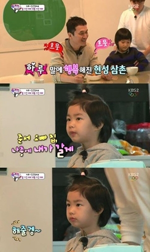 장현성은 “하루를 보면 흐물흐물해지는 기분이다”라고 말하며 완벽한 하루앓이 모습을 보였다. 또한 하루가 장현성에 “나중에 집에 놀러 갈게”라고 말을 하자 “놀러와. 삼촌이 재밌게 해줄겡”이라며 혀짧은 애교를 선보여 웃음을 자아냈다.