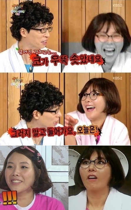 이에 박미선은 “신봉선이 넘어져서 코가 부었나보다”라고 말했고 유재석은 “넘어진 것 치고는 코가 우뚝 솟았다”고 말해 웃음을 자아냈다.