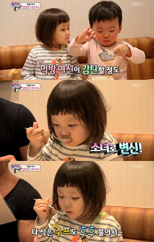9일 방송된 KBS ‘해피선데이-슈퍼맨이 돌아왔다’에서 이종격투기 추성훈 선수의 딸 추사랑이 먹방을 포기하고 조신한 모습을 보여 눈길을 끌었다.