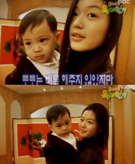 영상 속 전지현은 당시 god가 돌보면서 화제가 된 아기 재민이와 친해지려 애쓰는 모습으로, 풋풋한 얼굴이 인상적이다.