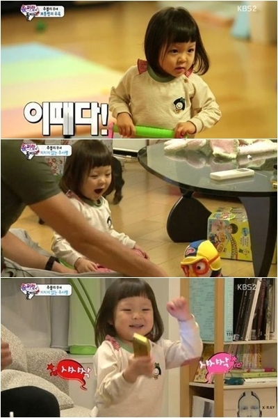 16일 방송된 KBS2TV ‘해피선데이-슈퍼맨이 돌아왔다’에서 이종격투기 추성훈 선수의 딸 추사랑은 집에 깜짝 방문한 격투기 선수 김동현의 선물에 셔플댄스를 췄다.