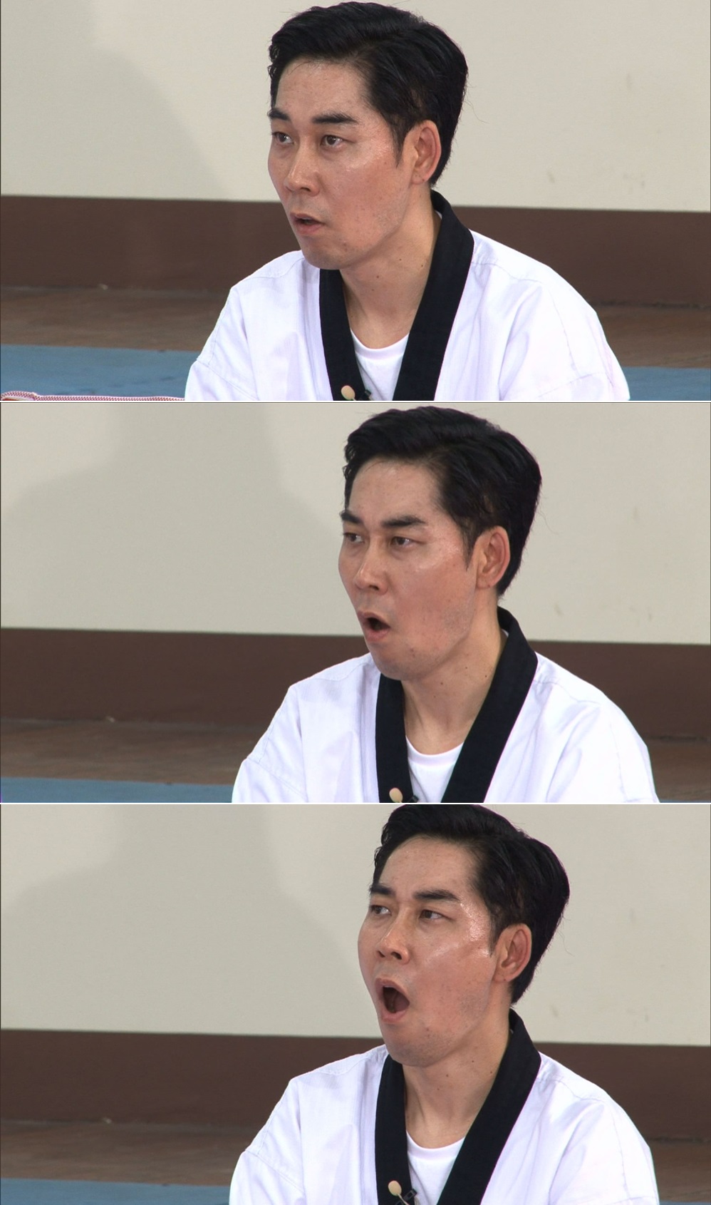 18일 KBS 2TV ‘우리동네 예체능’ 48회에서 예체능 태권도단 첫 수업 중 김연우 유체 이탈 3단 변신 표정이 포칙된 것.