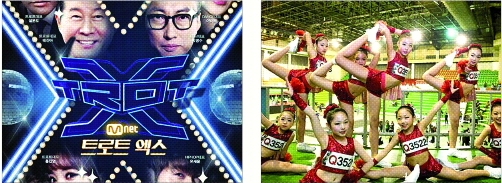 21일 첫 전파를 타는 엠넷 ‘트로트 엑스’는 아예 ‘오디션’이라는 단어를 지워버렸다. 대신 트로트 음악으로 꾸며지는 ‘트로트 버라이어티 쇼’라는 사실을 앞세웠다. ‘트로트 엑스’(왼쪽)는 트로트와 다른 장르의 뮤지션이 결합한 프로듀서 팀이 참가자와 한 팀을 이뤄 다른 팀과 경쟁한다. 우승자에게는 5억원의 상금이 주어지는 등 오디션의 외형을 갖췄지만 ‘오디션’은 아니라고 선을 긋는다. 김기홍 엠넷 국장은 “기존 오디션 프로그램이 일반인들 사이에서 스타를 발굴한다면, ‘트로트 엑스’에는 일반인을 비롯해 아이돌 가수나 무명 가수 등도 참가한다”면서 “‘뽕끼’가 있는 모든 사람들의 대결이라는 점에서 오디션보다 서바이벌에 가깝다”고 설명했다.