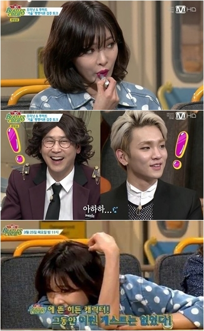 현아의 돌발 행동에 신동엽은 어색한 미소를 짓더니 이내 “난 이런 게 좋다. 얼마나 편안해 보이느냐”고 재치 있게 말했다. 신동은 현아가 립스틱 바르는 모습을 재연해 웃음을 자아냈다.