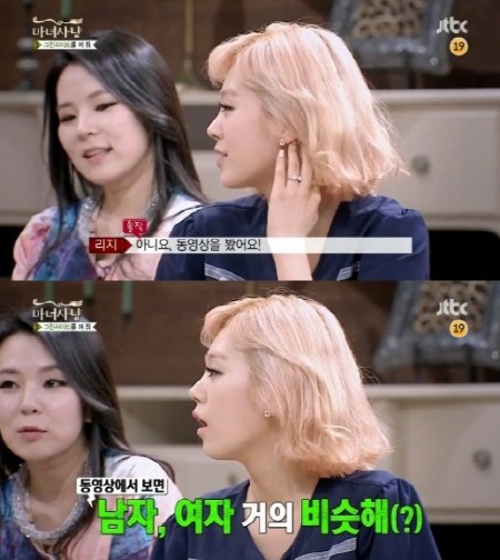 이에 ‘마녀사냥’ MC 신동엽이 리지에게 “잡지에서 그런 내용을 본 적 있느냐”고 물었고 리지는 “아니다. 동영상을 봤다. 동영상에서 보면 남자, 여자 거의 비슷하다”고 거침없는 답변을 했다.