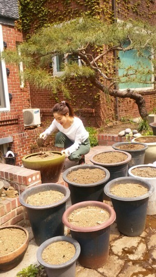 공개된 사진에는 박진희가 화분의 흙을 골고루 다듬고 있는 모습이 담겨져 있다.