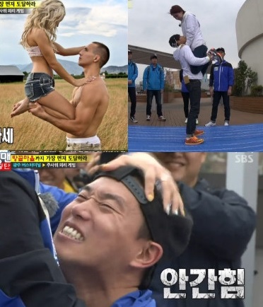 남자가 여자의 다리만 잡고 안는 자세로 이상화는 “이걸 어떻게 하느냐”고 했고 개리는 “나를 들어야 하는 거 아니냐”고 했다. 결국 개리가 이상화를 안아들고 안간힘을 써봤지만 무너지고 말았다.