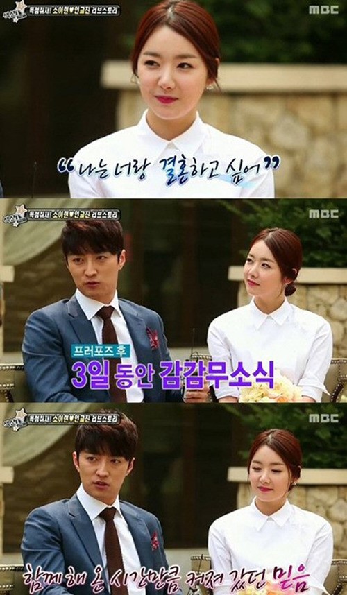 이에 대해 소이현은 “여자들은 프러포즈에 대한 로망이 있는데 나는 시끄러운 것보다 조용하고 진심어린 프러포즈를 동경했었다. 꽃과 실반지가 있고 편지 한 장 정도는 있었으면 좋겠다고 생각했는데 고깃집에서 소주 한 잔 하며 했다”고 털어놔 웃음을 자아냈다.