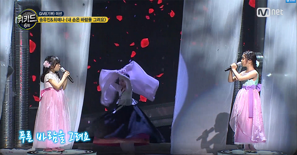 24일 오후 방송된 Mnet ‘위키드’에서는 송유진·최예나 어린이가 ‘내 손은 바람을 그려요’로 듀엣 무대를 꾸몄다.