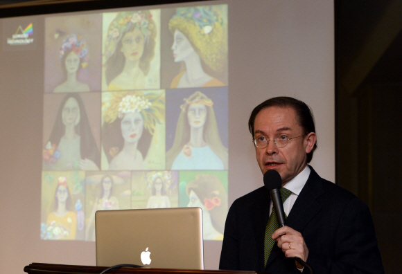 프랑스 뤼미에르 감정단 쟝 페니코가 27일 오후 한국프레스센터에서 한국 검찰의 미인도 진품 판정을 반박하는 기자회견을 갖고 있다. 2016.12.27 도준석 기자 pado@seoul.co.kr