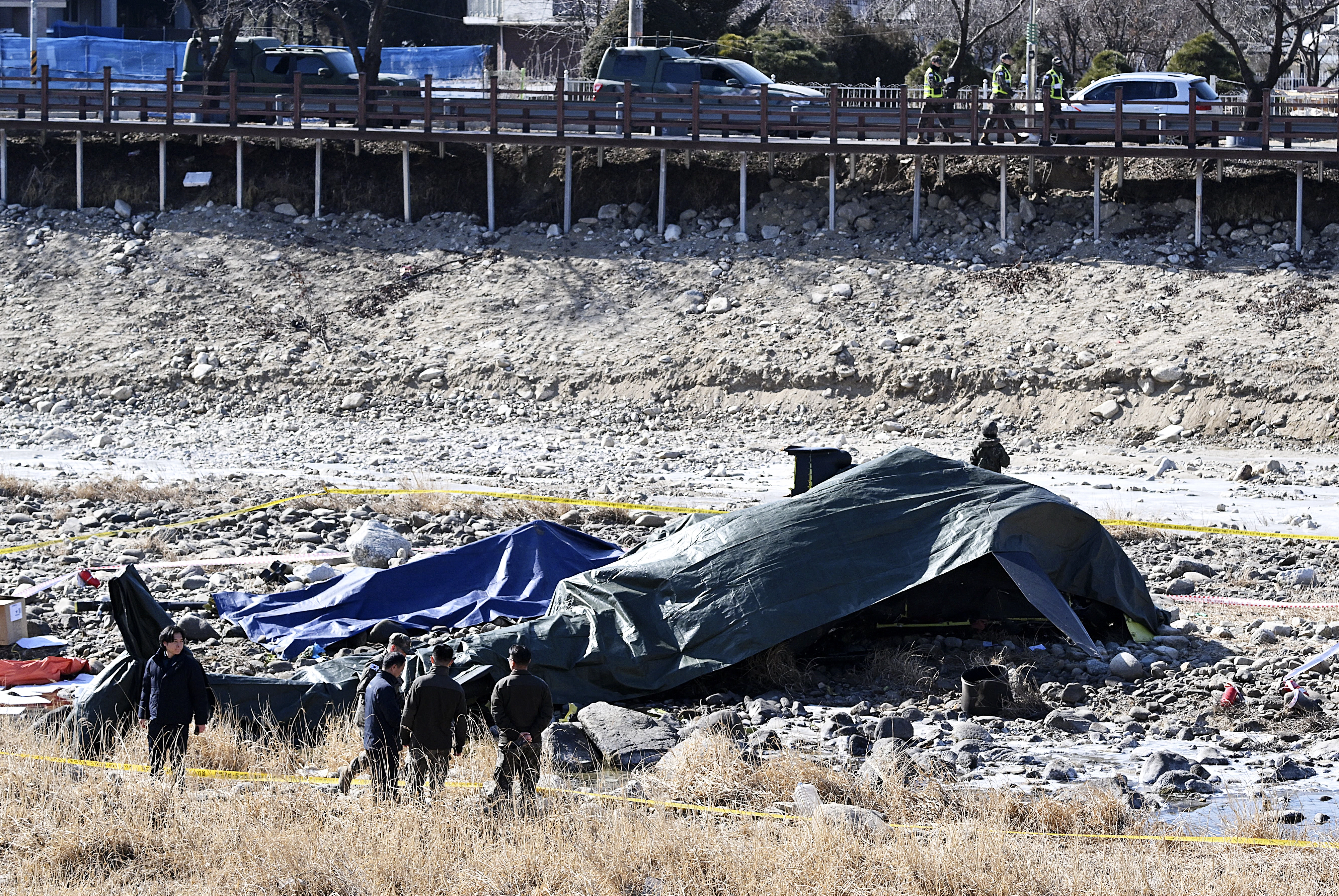 사진은 군 관계자들이 이날 추락한 군 헬기 잔해 근처에서 현장을 통제하고 있는 모습.