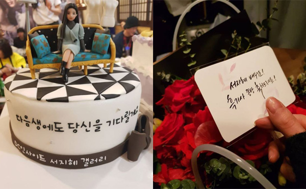 사진에는 팬들이 서지혜에게 보낸 ‘흑기사’ 종영 기념 케이크와 꽃다발, 카드가 담겼다. ‘흑기사’에서 서지혜가 맡았던 캐릭터 ‘샤론’을 연상케 하는 예쁜 케이크가 눈길을 사로잡았다.