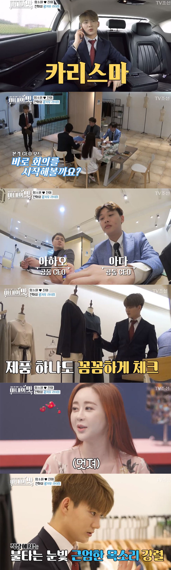 의류 회사를 운영 중인 진화는 진지하게 전화를 받는 모습부터 간부 회의에 참석하는 등 CEO의 모습을 보였다. 이는 평소 진화가 보여 준 모습과는 사뭇 다른 모습이었다. 아내 함소원에게 애교를 부리는 것과는 달리 진지하면서도 카리스마 넘치는 눈빛을 보여준 것.
