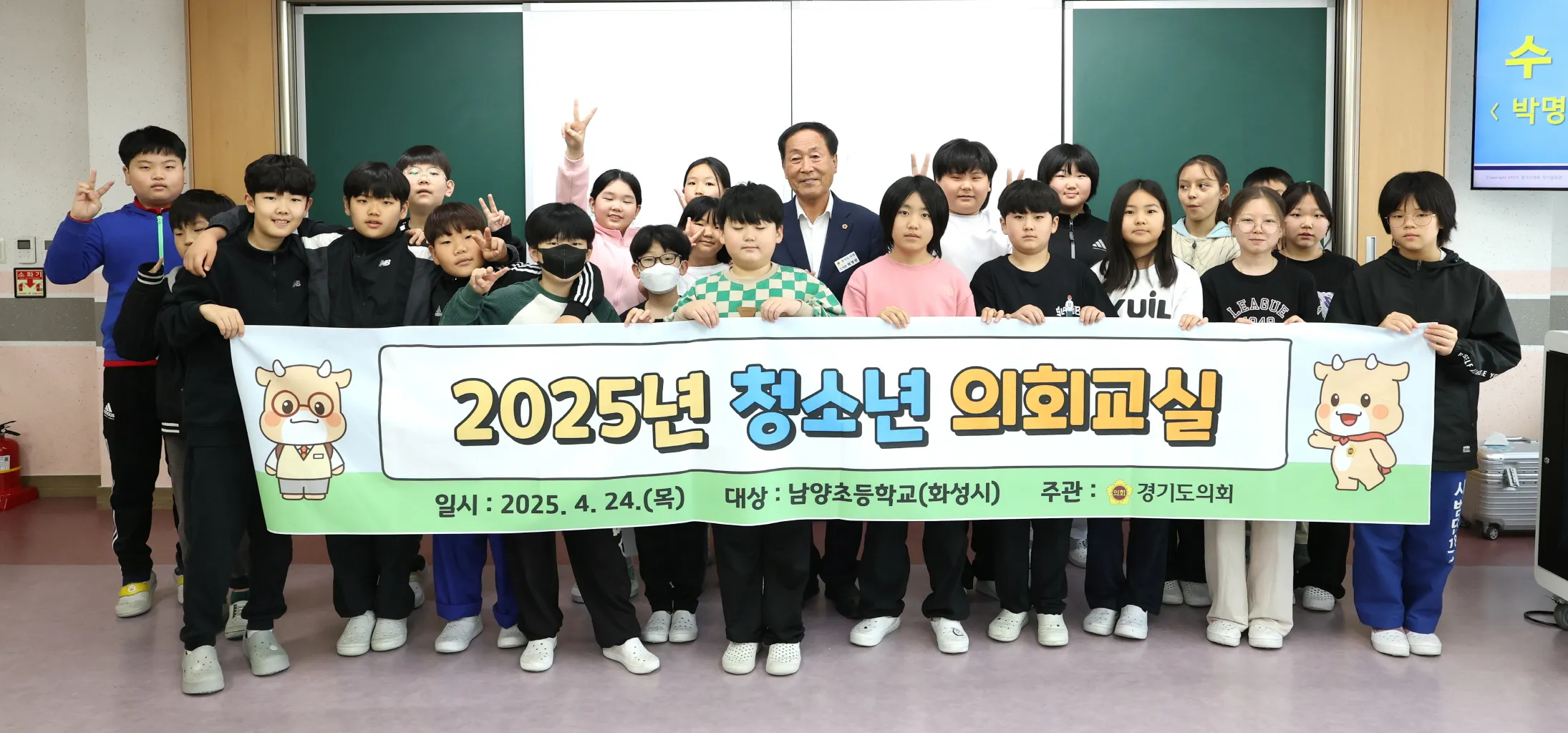 경기도의회 농정해양위원회 박명원 의원(국민의힘, 화성2)이 지난 4월 24일(목), 화성시 남양초등학교에서 열린 ‘청소년의회교실’ 프로그램에 참석해 인사말을 전하고 참가 학생들에게 수료증을 수여했다.