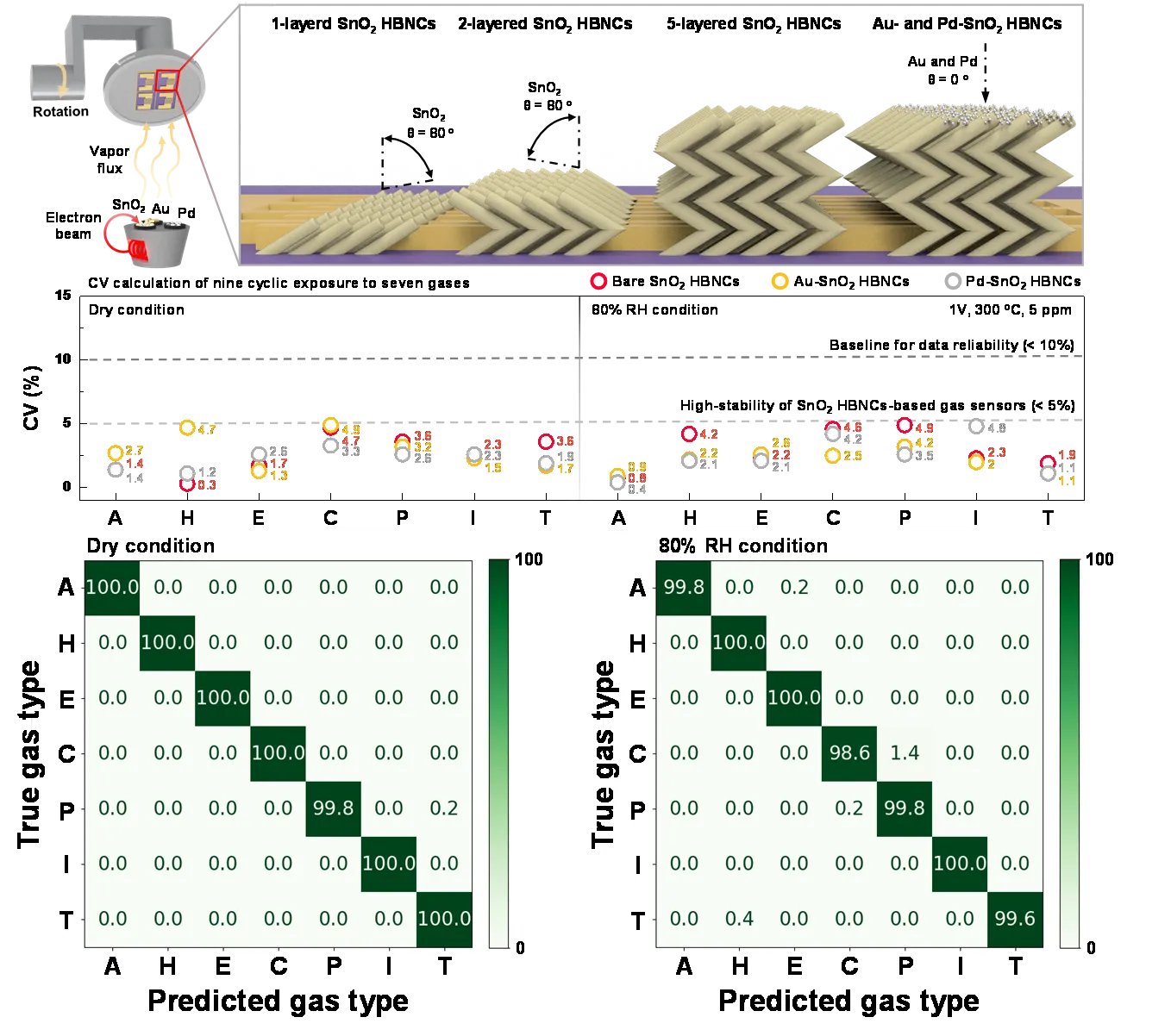 연구팀은 산화주석(SnO2) 기반 1차원 나노구조체에 금(Au)과 팔라듐(Pd) 나노촉매를 정밀 코팅하고, 표면 기능화 및 열 노화(Aging) 공정을 적용해 센서 신호 변동 계수를 평균 3% 이하로 낮췄다.