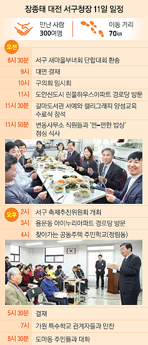 이에 앞서 장 구청장은 이날 지역 아파트들을 찾아다니며 센터 설치과정과 역할을 알리는 데 온 힘을 쏟았다. 오전 11시쯤 도안신도시 린풀하우스아파트 경로당을 찾아 노인들과 바닥에 빙 둘러앉았다. 그는 이 사업을 자세히 설명한 뒤 “이웃이 자주 만나고, 얘기해야 건강해진다”며 화목한 공동체를 만들어달라고 당부했다. 주민들은 큰 기대감을 보이면서 급한 민원들도 쏟아냈다. “옥녀봉에 계단을 만들어달라”, “일부 구간에 산책로가 없어 하천 숲에 있던 뱀이 나와 아파트단지로 잠입한다” 등 끊임이 없다. 장 구청장은 “구청 소관이 아닌 것은 어렵고, 경로당 개소 선물로 노래방 기기는 적극 검토하겠다”고 하자 웃음소리와 동시에 박수가 터졌다.