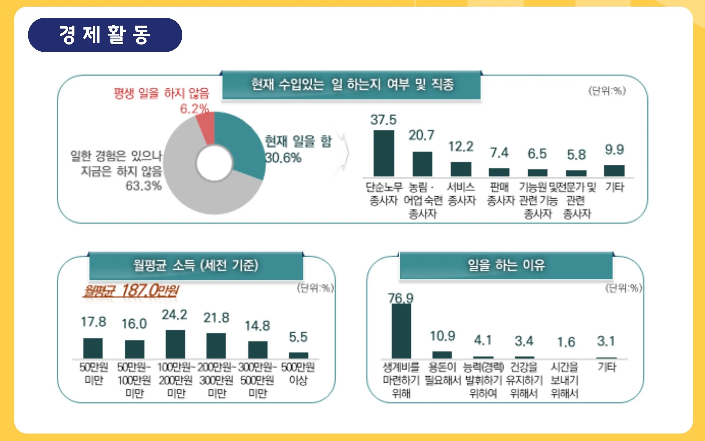 현재 근로 중인 노인 비율은 30.6%이며, 근로 사유로 생계비(76.9%)와 용돈(10.9%) 마련이 대부분을 차지했다.