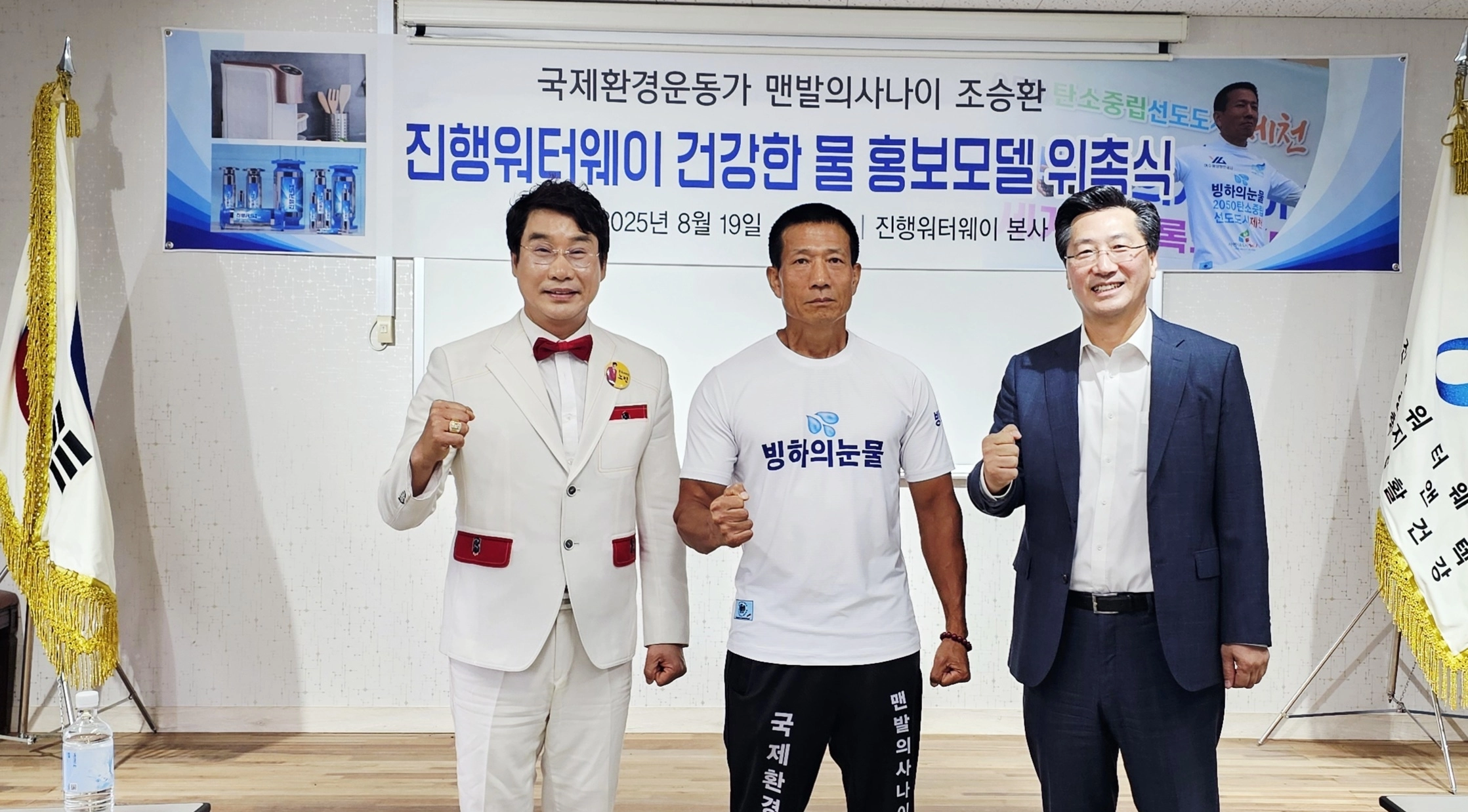 광양시·고흥군 홍보대사이자 환경운동가로 활동 중인 ‘맨발의 사나이’ 조승환 씨가 19일 진행워터웨이와 홍보모델 계약을 체결하고, 모델료 전액을 미얀마 식수 문제 해결을 위해 기부했다.