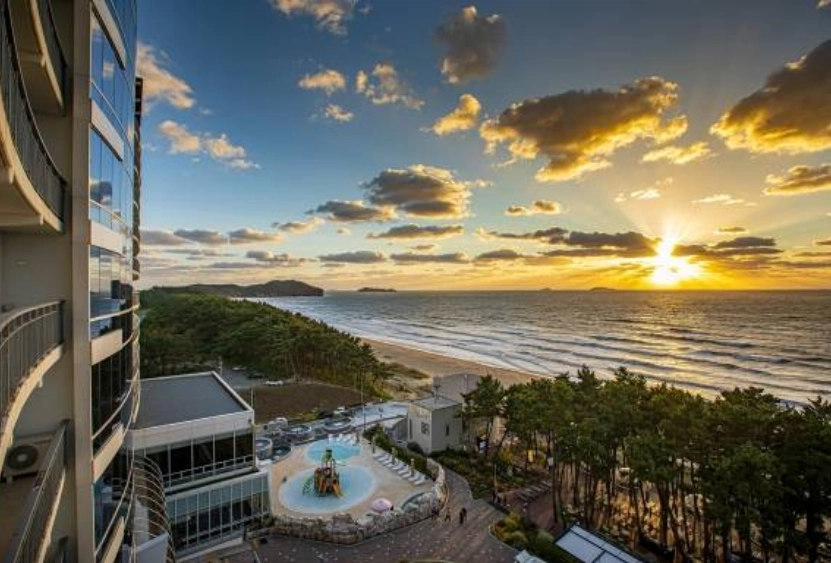 충남 태안 아일랜드 리솜 객실에서 바라본 꽃지해변의 아름다운 낙조. 서울신문DB