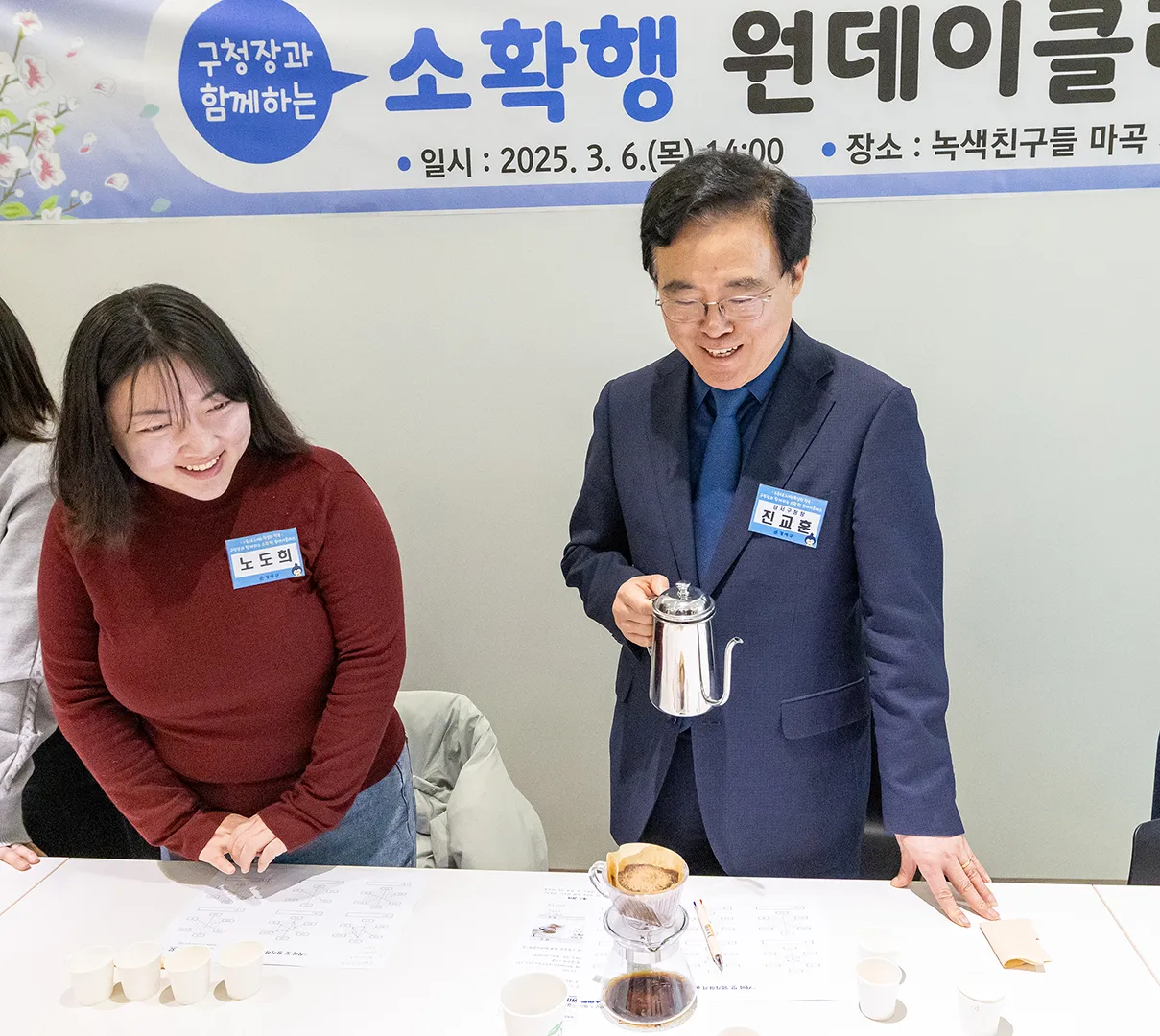 수업이 시작되자 참여자들은 돌아가면서 나이와 직업 등 간단히 자기소개하는 시간을 가졌다. 취업준비생부터 커피가 좋아서 반차를 내고 참여했다는 직장인까지 다양했다. 진 구청장은 “저는 57세 구청장입니다”라고 짤막하게 본인을 소개하며 “커피를 좋아하는 아내를 위해 커피 내리는 법을 배우러 왔다”고 참여 동기를 밝히자 박수가 쏟아졌다.