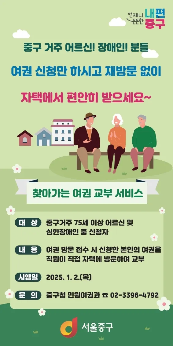 서울 중구는 올해부터 ‘찾아가는 여권 교부 서비스’를 운영한다고 9일 밝혔다. 대상은 75세 이상 어르신과 중증 장애인이다.