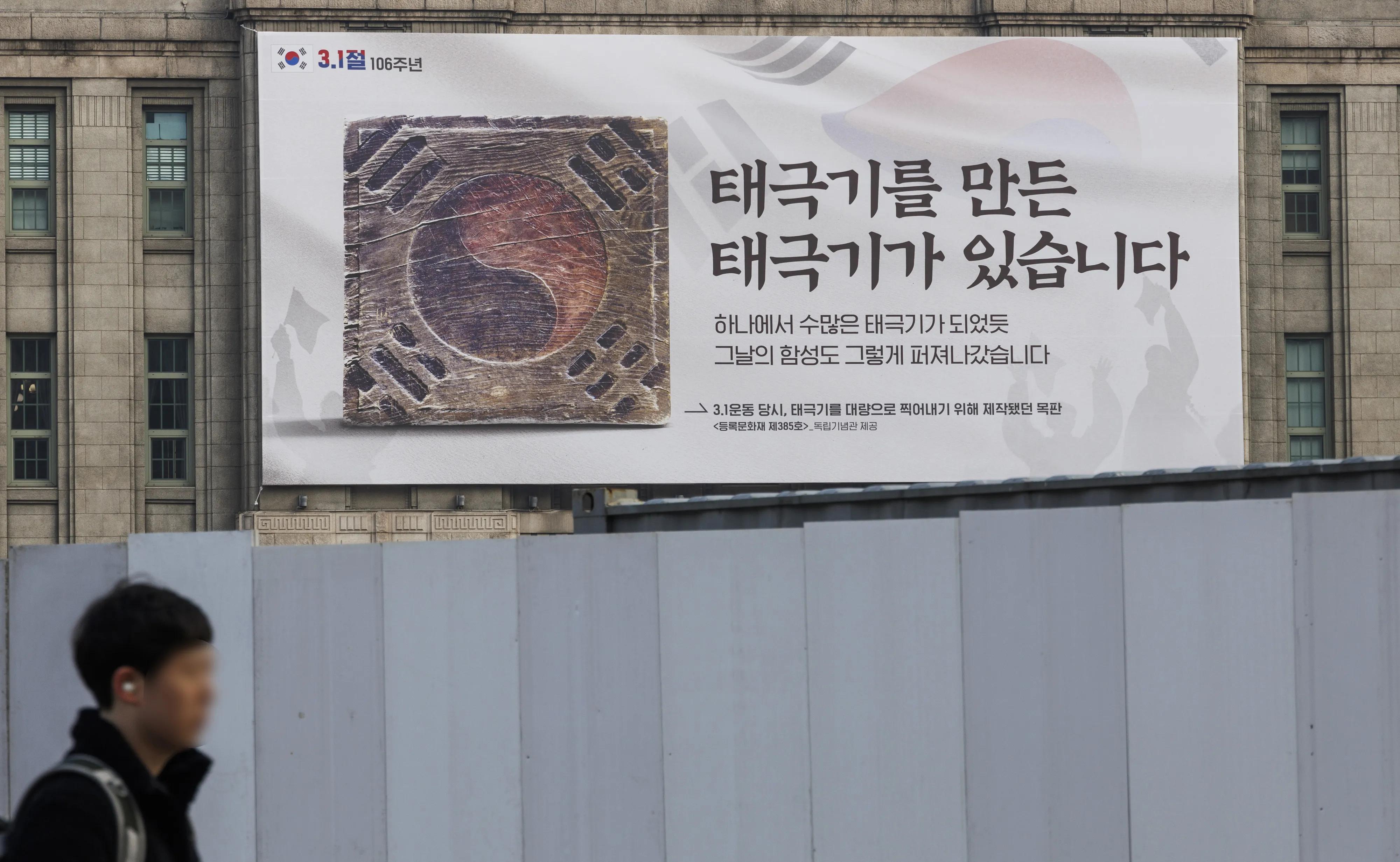 서울시는 106주년 3·1절을 기념해 서울도서관 외벽 대형 글판인 서울꿈새김판을 새로 단장했다고 26일 밝혔다. 꿈새김판에는 ‘태극기를 만든 태극기가 있습니다’, ‘하나에서 수많은 태극기가 되었듯 그날의 함성도 그렇게 퍼져나갔습니다’라는 문구를 넣었다. 국가등록문화재 제385호이자 1919년 3·1 운동 당시 태극기를 대량으로 찍어내고자 제작한 태극기 목판의 사진도 담았다. 연합뉴스