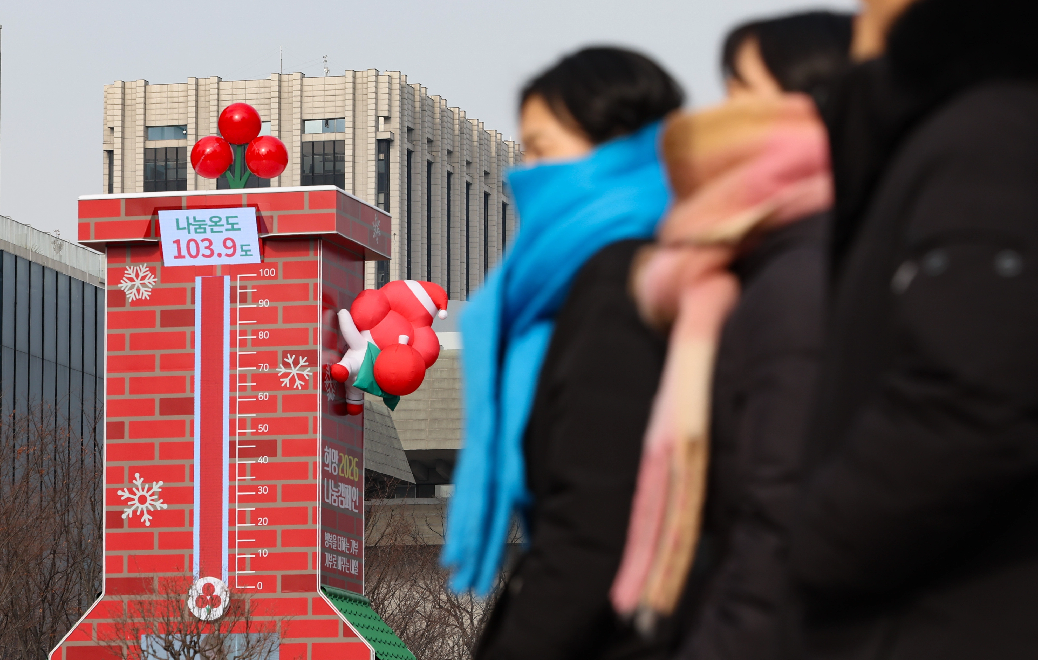 12일 서울 종로구 광화문광장에 있는 사랑의 온도탑 나눔온도가 103.9도를 나타내고 있다. 사랑의열매 사회복지공동모금회는 ‘희망 2026 나눔 캠페인’ 사랑의 온도탑 나눔온도가 100도를 돌파했다고 밝혔다. 뉴시스
