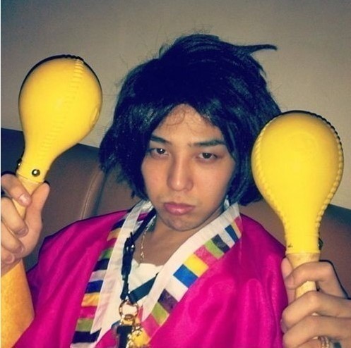 사진 속 지드래곤은 부스스한 단발 가발에 분홍색 색동저고리를 착용하고 각설이 패션을 선보이고 있다. ‘패션 리더’ 지드래곤의 망가진 모습이 눈길을 끈다.