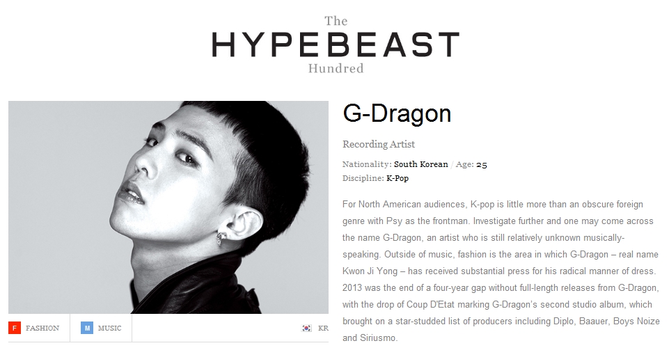 최근 세계적인 웹매거진 하이프비스트(HYPEBEAST)가 선정한 ‘2013 영향력 있는 인물 100인’에 지드래곤이 선정됐다. 순위에 이름을 올린 한국인은 지드래곤과 이건희(72) 삼성그룹 회장뿐이다.