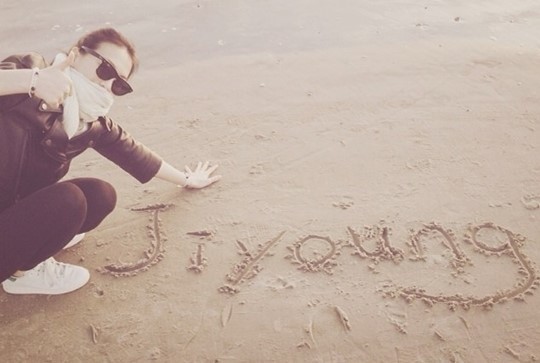 강지영은 11일 자신의 인스타그램에 근황 사진을 올렸다. 사진 속 강지영은 해변의 모래사장에 새긴 자신의 이름 앞에서 포즈를 취하고 있다. 올블랙 패션에 선글라스를 착용한 시크한 패션을 선보이고 있다.