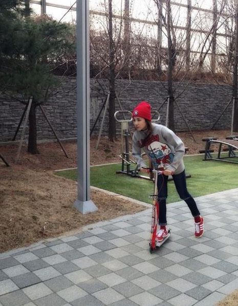 사진 속 산다라박은 레드컬러로 맞춘 비니와 운동화에 스머프 캐랙터가 돋보이는 집업 점퍼를 입고 퀵보드를 타고 콘서트 리허설장으로 출근하고 있다.