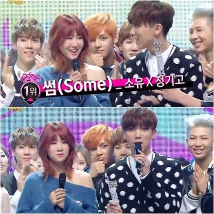소유와 정기고는 1일 오후 생방송으로 진행된 MBC ‘쇼! 음악중심’에서 ‘썸’으로 1위에 올랐다. 지난달 22일에 이어 2주 연속 1위다.