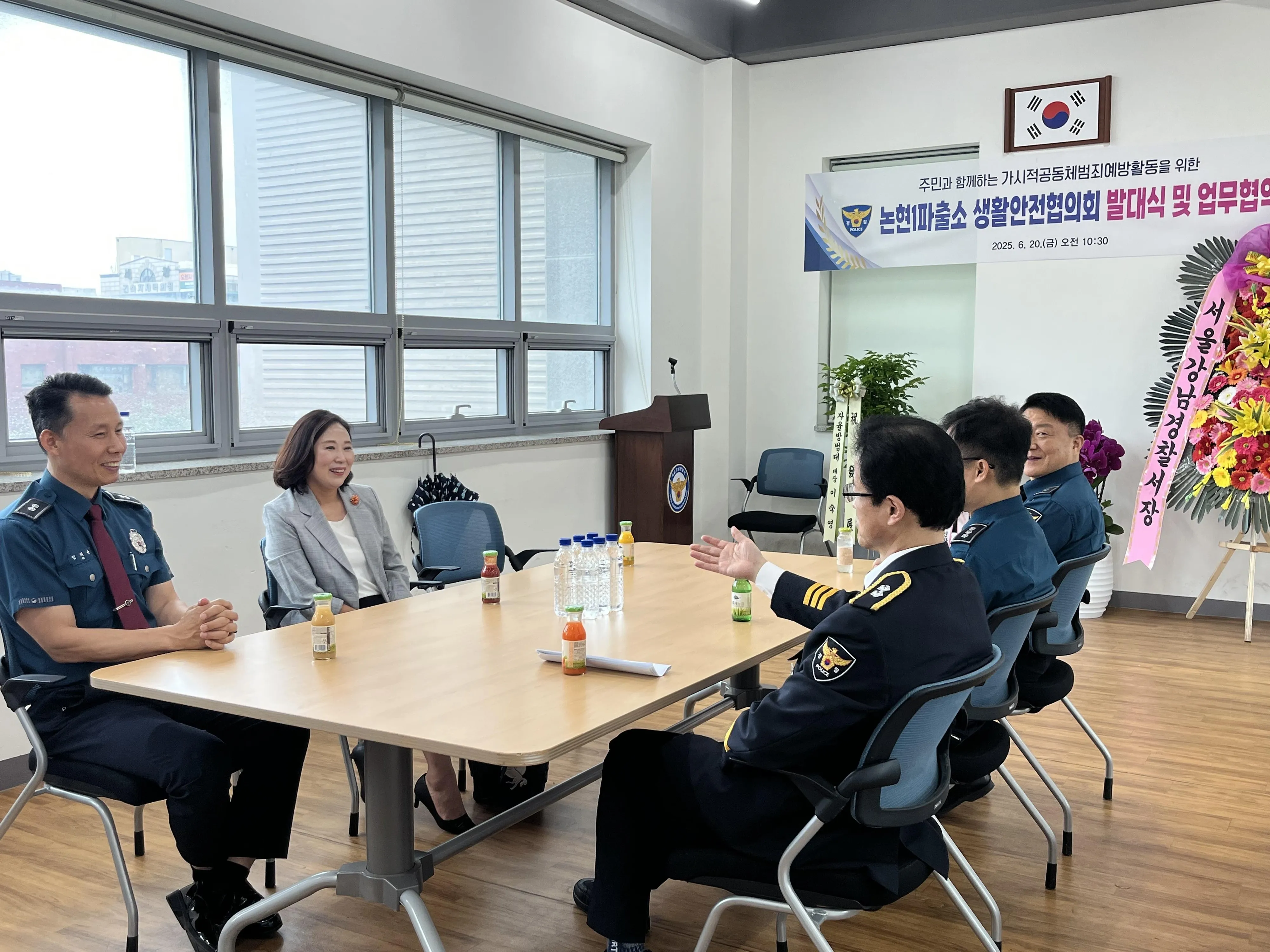 서울시의회 교육위원회 이새날 의원(국민의힘, 강남1)은 지난 20일 논현1파출소에서 열린 ‘생활안전협의회 발대식 및 업무협약식’에 참석해 주민 중심의 공동체 치안 활동을 적극 응원했다.