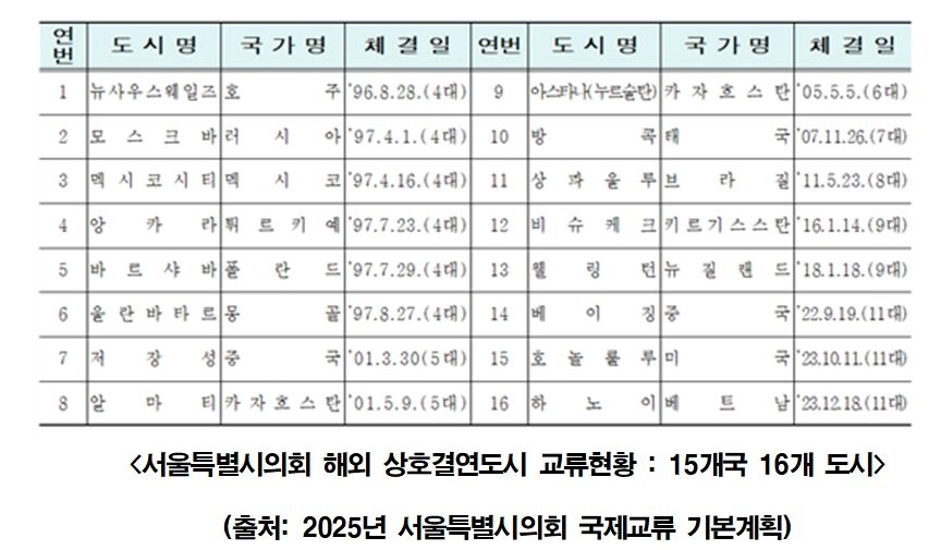 그동안 서울시의회가 상호결연을 체결하고, 국외 지방의회와 교류협력 활동을 이어오고 있음에도, 현재 서울시의 ‘서울시 도시외교 증진에 관한 조례」에 따른 친선결연 및 우호협력협정도시와 서울시의회가 체결한 상호결연 도시의 명확한 구분을 하지 않고 있으며, 상호결연 체결 근거와 절차 또한 구체화되지 않은 채 추진된 것이 사실이다.