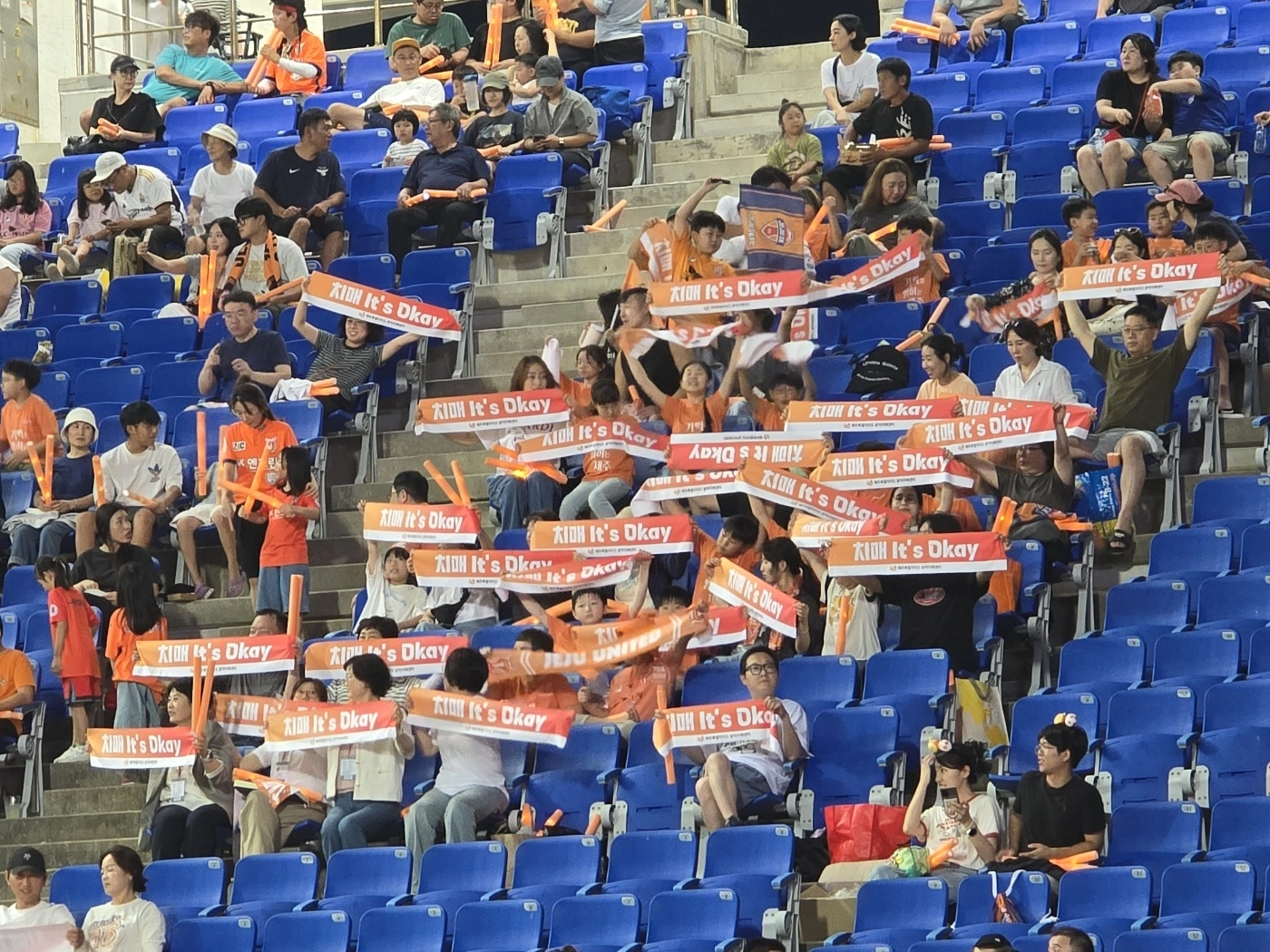 하프타임에는 관중에게 오렌지색 응원봉이 배포됐고, 관중들은 ‘기억을 밝히는 제주’ 구호를 함께 외치며 치매 극복과 환자 포용을 기원하는 감동적인 장면을 연출했다.