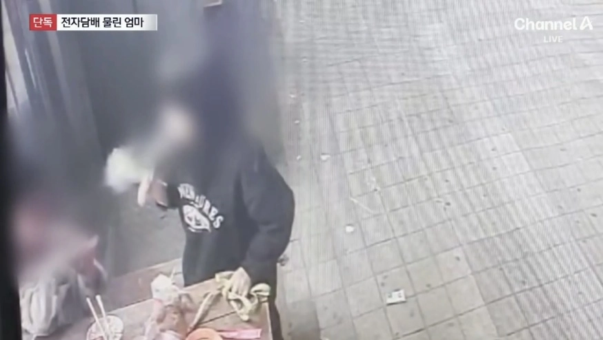 채널A가 공개한 당시 CCTV 영상을 보면 자신의 딸, 아들과 편의점 야외 테이블에 마주 앉은 A씨는 딸의 얼굴을 향해 담배 연기를 내뿜었다. 이어 딸이 A씨에게 손을 내밀자 전자담배를 건넸다. 딸은 전자담배를 입으로 가져가 빨아들이더니 남동생의 얼굴에 연기를 내뿜는 모습이다. 이어 미취학 아동인 남동생에게도 전자담배를 건네기도 했다.