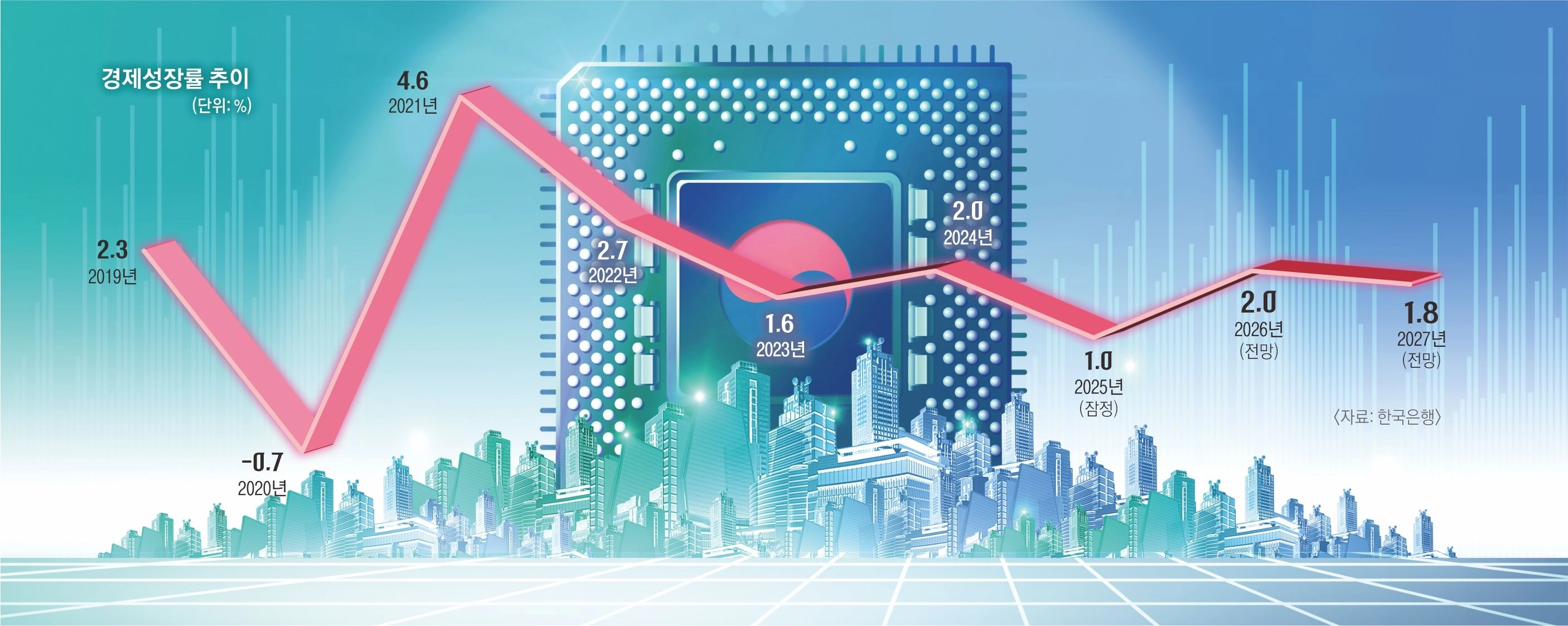 반도체 수출 호조와 내수 회복세에 힘입어 한국은행이 올해 경제성장률 전망치를 기존 1.8%에서 2.0%로 올렸다. 미국 관세 불확실성과 건설 투자 부진에도 반도체 경기 개선세와 예상을 뛰어넘는 세계 경제 회복세 등이 국내 경제 성장세를 이끌 것이라는 전망이다.