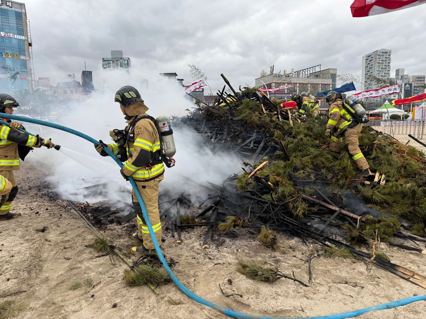 울산 동구 일산해수욕장에 쌓아둔 정월대보름 달집 더미에서 원인을 알 수 없는 불이 났다.