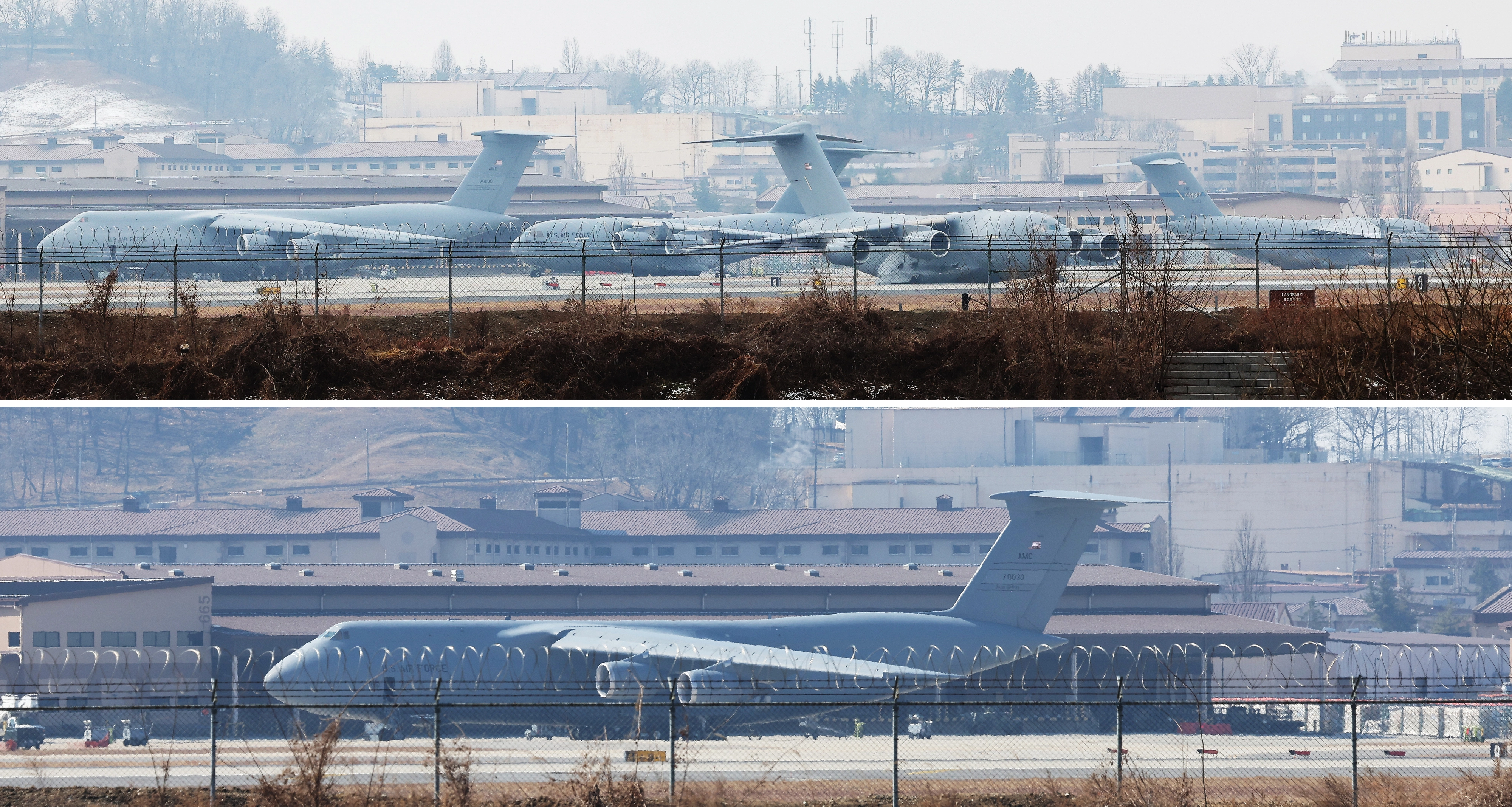 경기 평택 오산공군기지에서 식별됐던 미국 대형 수송기 일부가 한국을 떠나 미 알래스카 앵커리지 미군기지 등으로 향한 것으로 파악되면서 주한미군의 방공 자산이 중동으로 차출됐을 것이라는 관측이 10일 제기됐다. 사진은 지난 6일 캠프 험프리스에 C-5, C-17 등 수송기들이 대기하고 있는 모습(위 사진). 아래 사진은 지난 8일 C-5 수송기 한 대만 캠프에 남아 있는 모습. 연합뉴스
