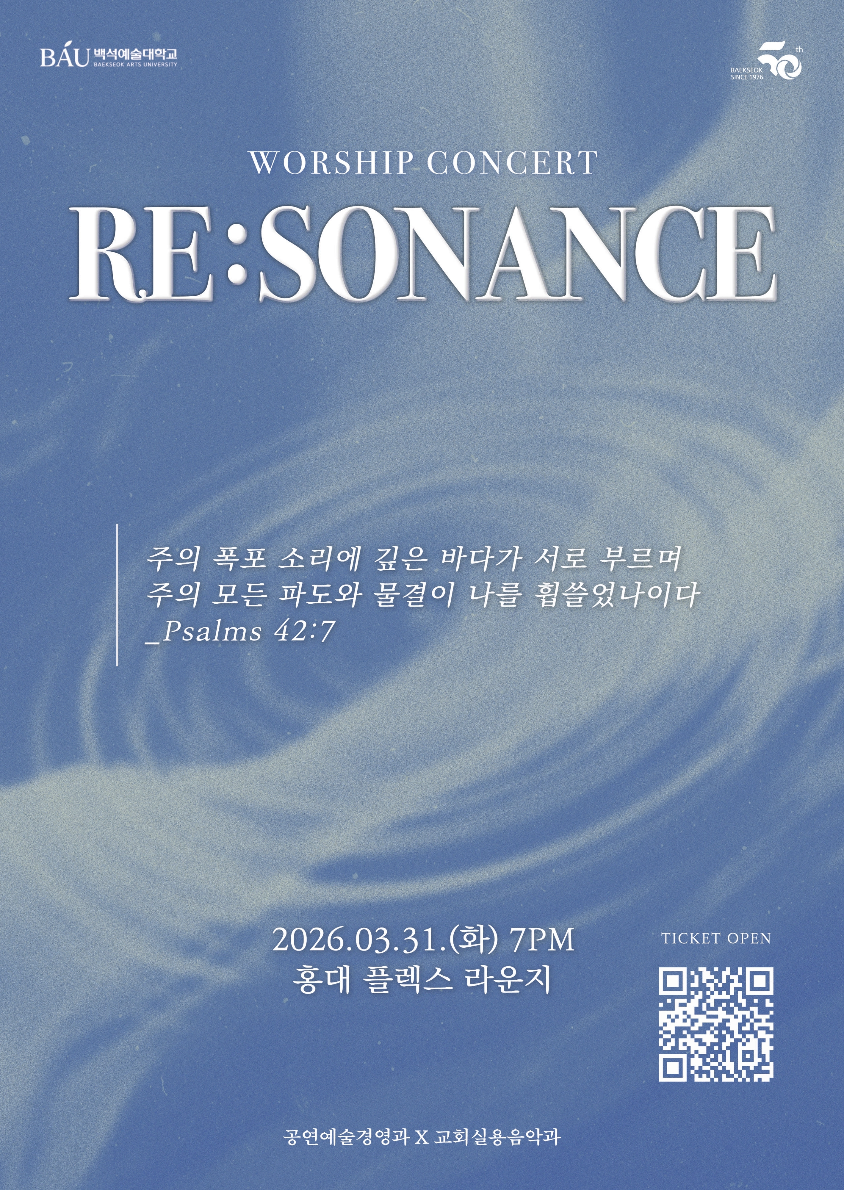올해로 건학 50주년을 맞는 기독교 대학인 백석예술대학교의 공연예술경영과와 교회실용음악과 졸업생·재학생들이 오는 31일 오후 7시 서울 마포구 홍대 플렉스라운지에서 청년들을 위한 찬양 콘서트 ‘RE:SONANCE(부제: 세상의 소음, 하나님의 음성)’를 개최한다.