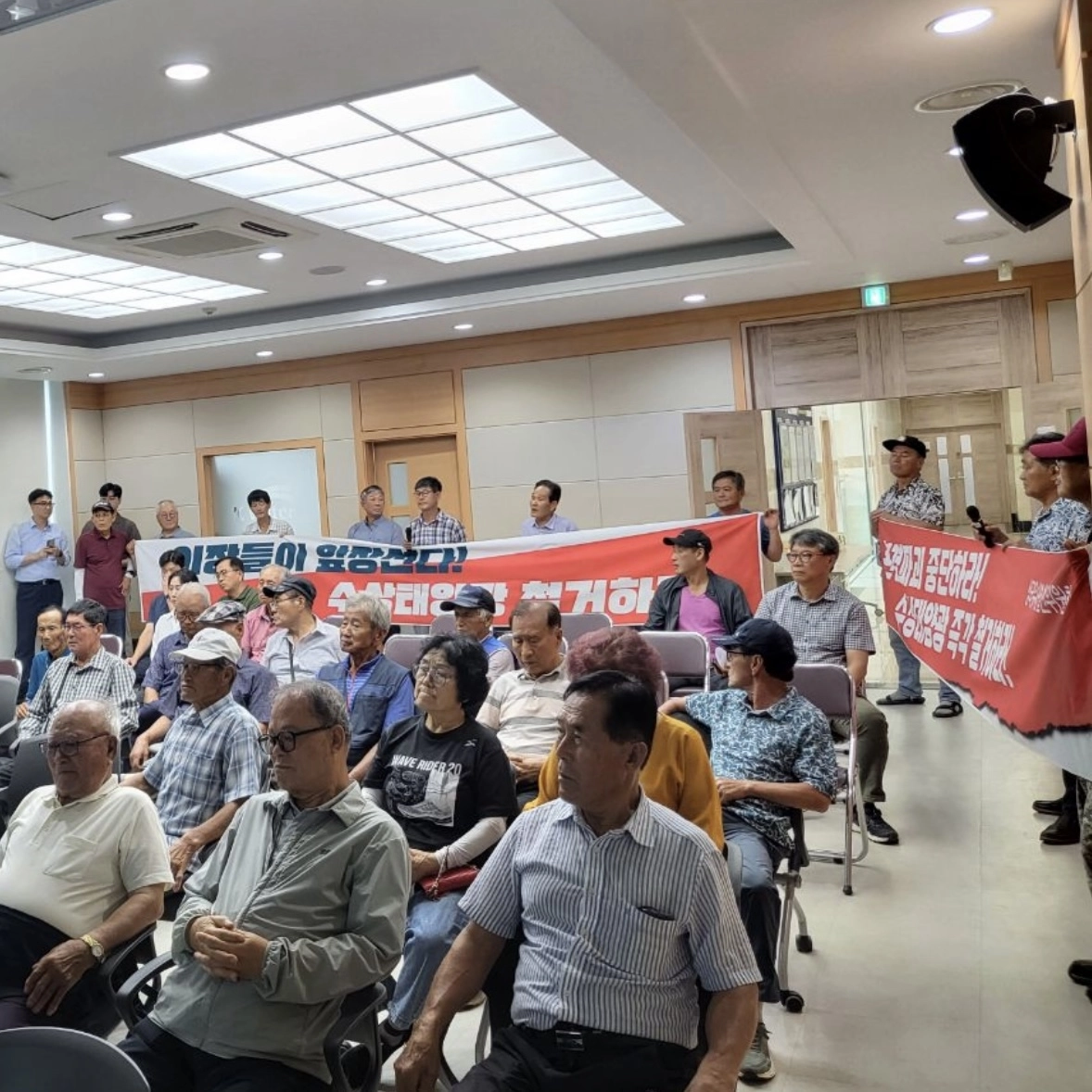 하지만 참석 주민 40여명 중 상당수가 개최 사실을 제대로 알리지 않은 ‘도둑 설명회’라며 거세게 반발하면서 설명회는 무산됐다. 삼국유사면 이장협의회 회원 등 일부 주민은 설명회장에 ‘수상태양광 철거하라’고 적힌 현수막을 들고 설명회 개최를 반대했다. 특히 이날 설명회에는 수자원공사가 시행하는 노인일자리사업 참여자 20여명이 동원됐다는 의혹이 제기됐다. 서울신문은 수자원공사에 수차례 전화했으나 연결되지 않았다.