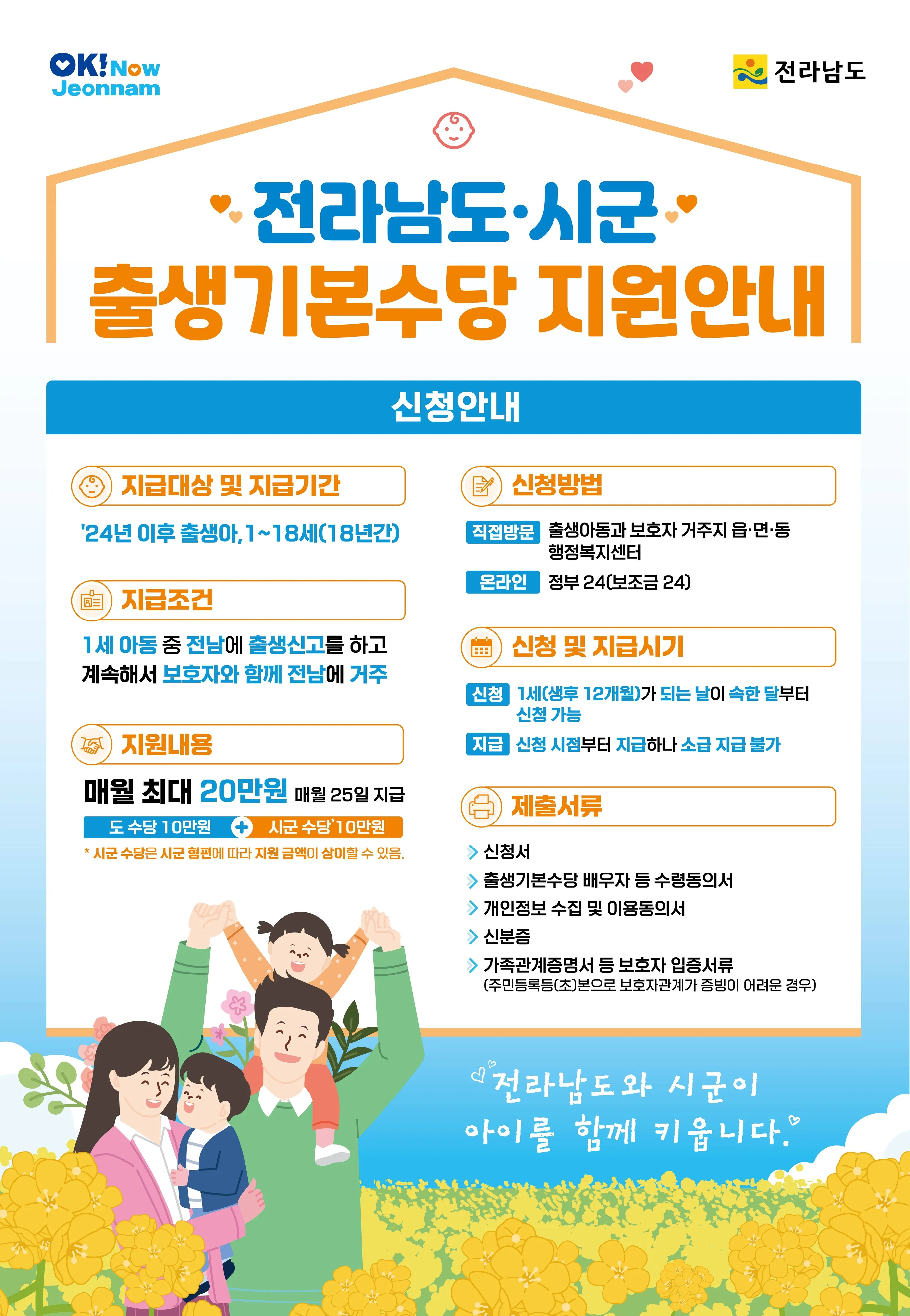 전라남도는 2024년 1월 전남에서 출생해 생후 12개월이 되는 출생아에게 ‘전라남도-시군 출생기본수당’을 24일 첫 지급했다고 밝혔다.